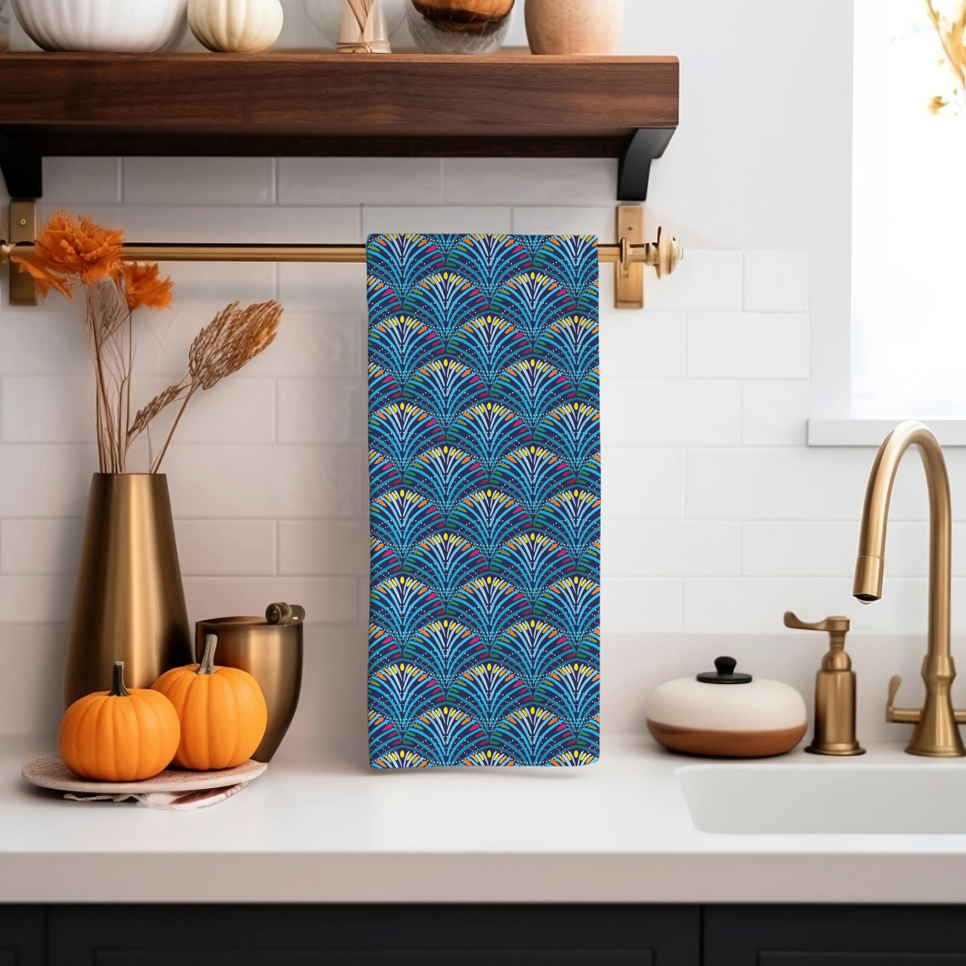 This gorgeous cluster of trees are sprinkled with the colors of autumn. The pattern creates a flowing picture of trees and colored leaves in a large forest. Along the base of each tree lies a string of lights, as if fairies had come for an autumn night visit. These lights bring a 3D effect to the trees.This is an 18x30 inch tea towel made of cotton twill. Machine wash it separately with cold water and delicate cycle, no bleach. Line dry.