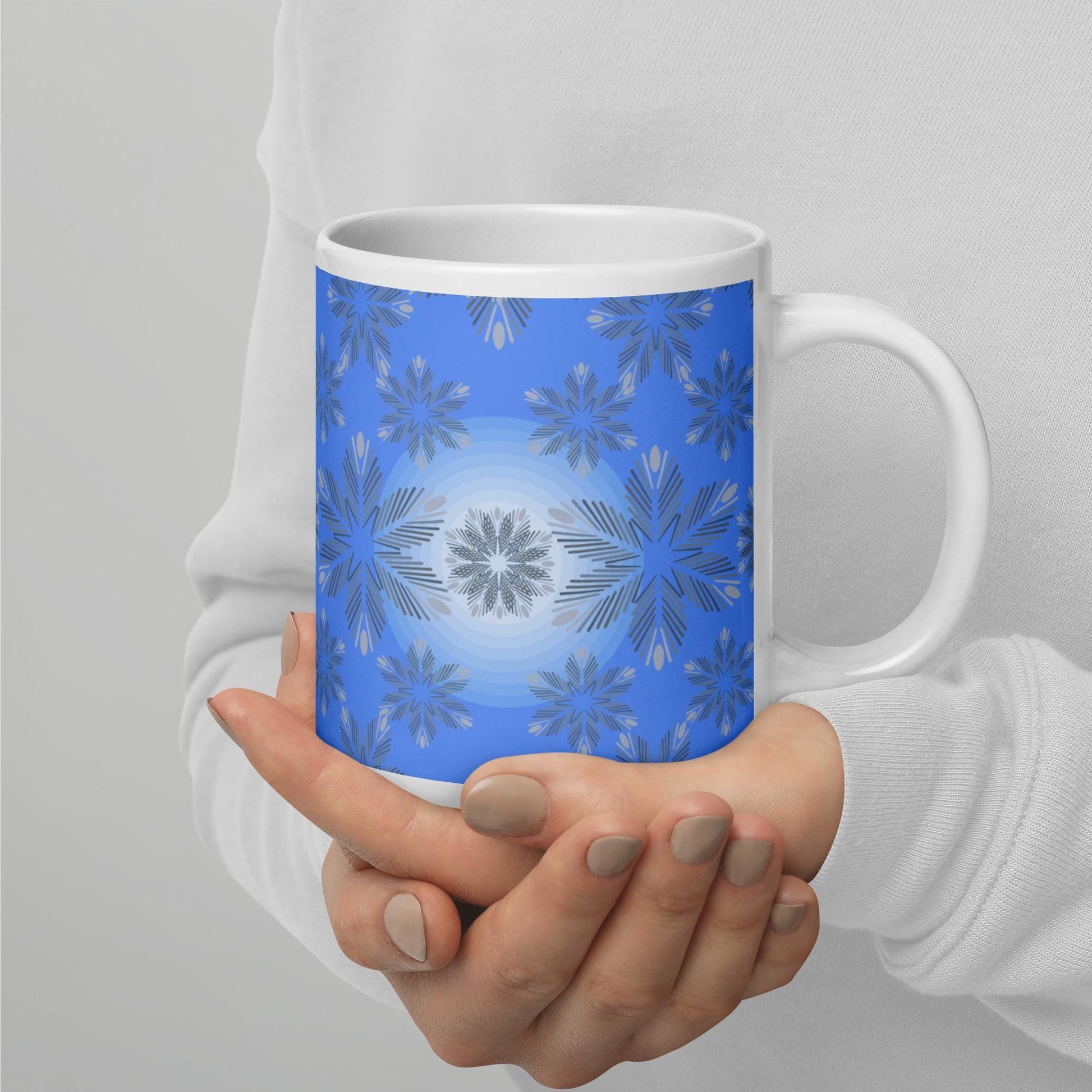 Look at these fancy snowflakes! A blue sky behind these snowflakes makes these designs sparkle. This mug will make a great give for anyone. It's unisex and comes in three sizes. Everyone will be surprised at its beauty. Whether you're drinking your morning coffee, evening tea, or something in between—this mug's for you! It's sturdy and glossy with a vivid print that'll withstand the microwave and dishwasher.