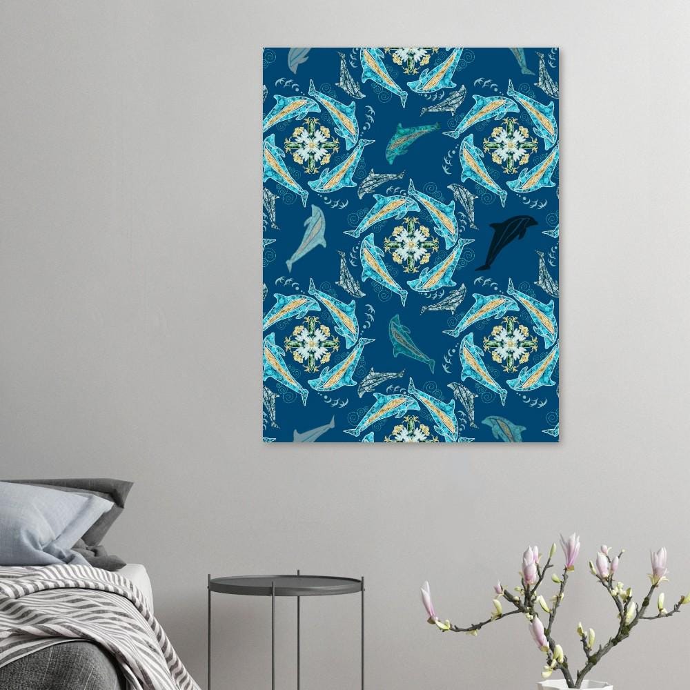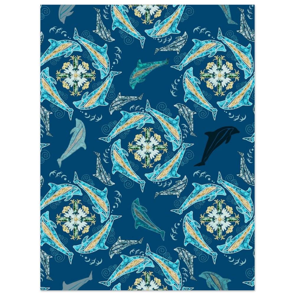 Are you in love with ocean animals? These swirling dolphins are showing you treasures of the deep. This hand-drawn image has no AI in it. It was scanned and completed in Photoshop and Illustrator.