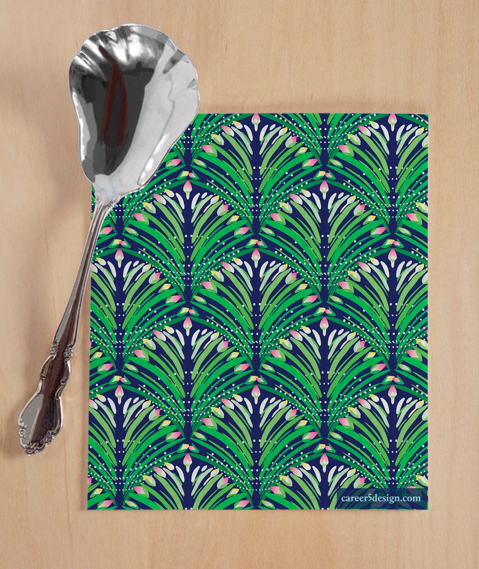 This drawing invites you to welcome spring with small pink and yellow tulip blossoms at the tips of green leaves. It is a Swedish dish cloth! Doing dishes, dusting, and other house cleaning tasks are more fun when you have a beautiful cloth in your hand.