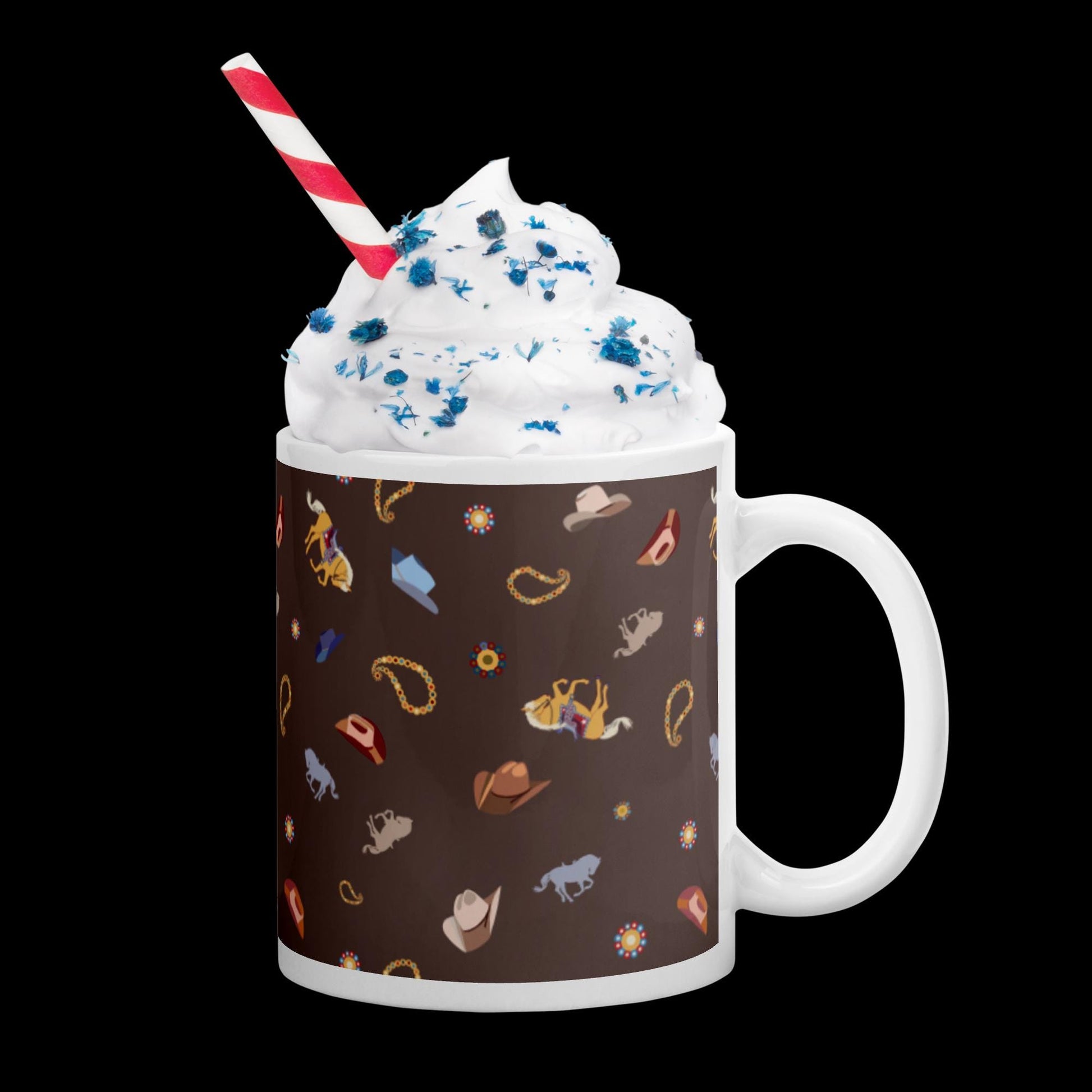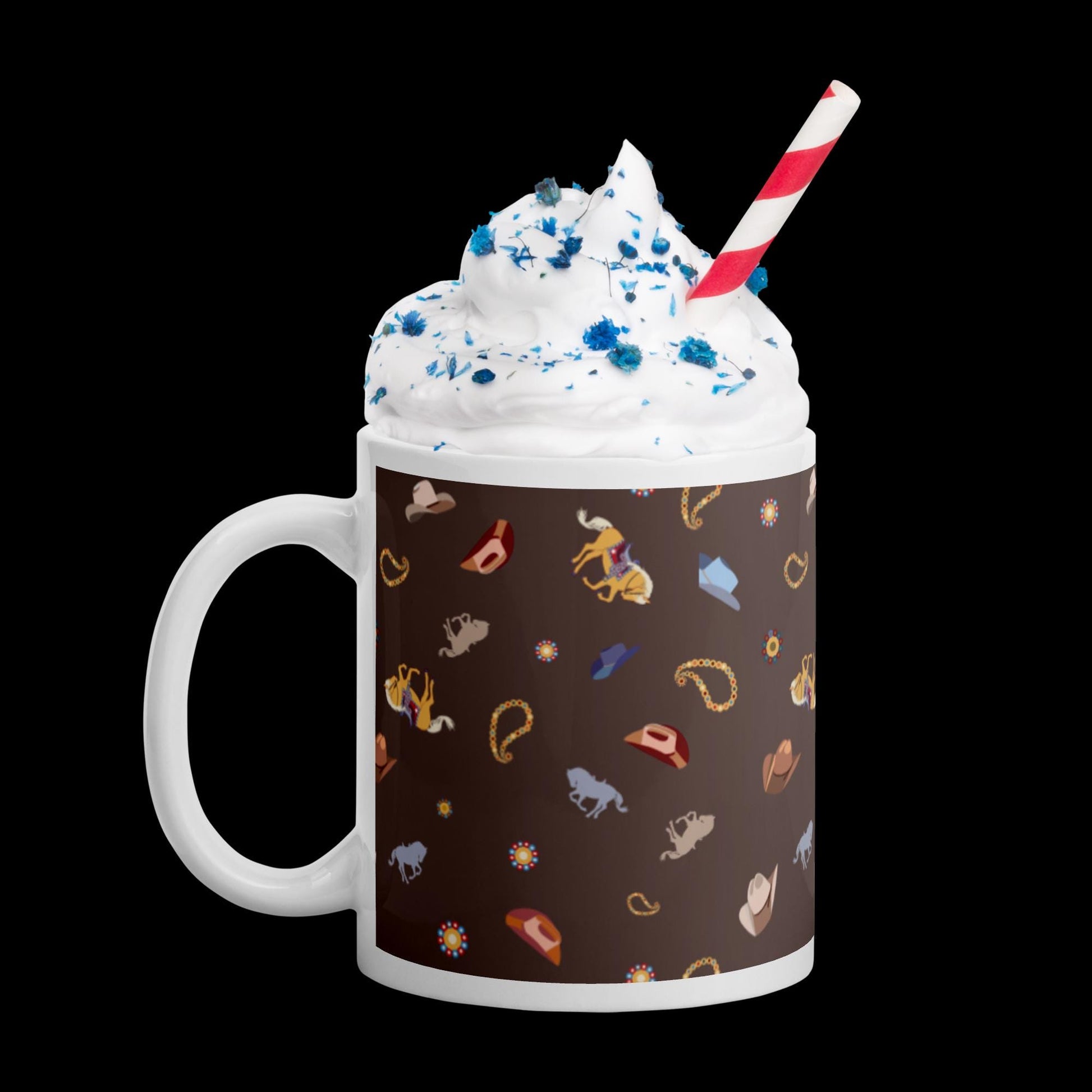 Wetern design is so fun! Cowboy hats, paisleys, and horses fill this design on a fine 11 oz. mug. The brown background matches the Color of the Year mocha brown color, so your mug will be perfect for today's home decor!